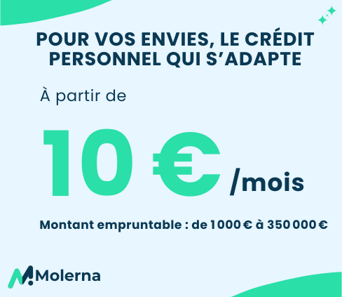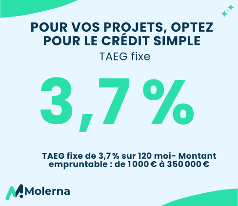 Molerna est une plateforme de mise en relation en matière de crédit (nous ne sommes ni banque mais établissement de crédit). Les offres sont proposées par nos partenaires, sous réserve d’acceptation de votre dossier.